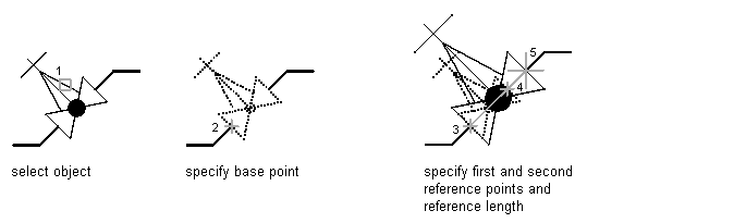 As an example, in the following procedure you increase the size of a schematic symbol by specifying the reference length and 2 reference points, and then dragging the symbol to specify the new length. The numbers enclosed in parentheses refer to the illustration that follows the procedure.