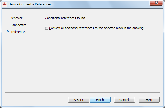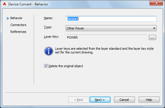 You can convert a single AutoCAD block, MvBlock, or MvPart to a device. Because devices are style-based objects, and all style-based objects are defined by styles, this creates an associated device style as well.