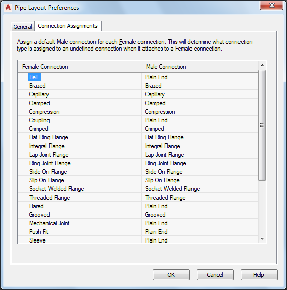 - In the Pipe Layout Preferences dialog box, click the Connection Assignments tab.