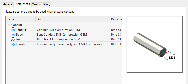 A conduit part routing preference includes one or more connection types (such as set screw) in the available part sizes for conduits and fittings. A preview of the selected part displays to the right of the dialog box. The image to the right provides a graphical representation of the selected part.