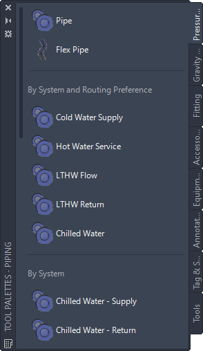 An object tool inserts an object, such as a duct or a pipe, into a drawing. When you add an object with a specific object tool, the object has the settings that are defined in the tool, which facilitates the design process and enhances consistency across your project drawings.