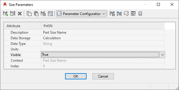 Note: The default data storage type for the PrtSN (Part Size Name) attribute is Table; however, you can change the data storage type to Calculation. Defining the PrtSN attribute as a calculated value enables you to define the name of each part size based on the values of other attributes, such as height and width, and provides additional options in the Blocks & Names section of the block-based building environment.