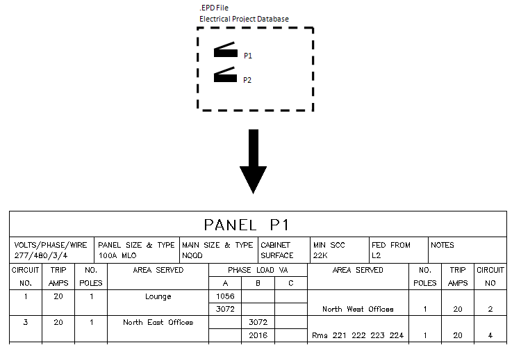 For construction documents, panel schedules are created using the electrical project database. Also, circuit data originates directly from the electrical project database.
