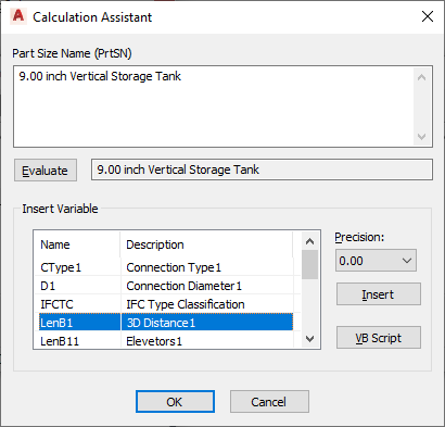 - At the top of the dialog box, click the value for Part Size Name (PrtSN), and enter inch Vertical Storage Tank.