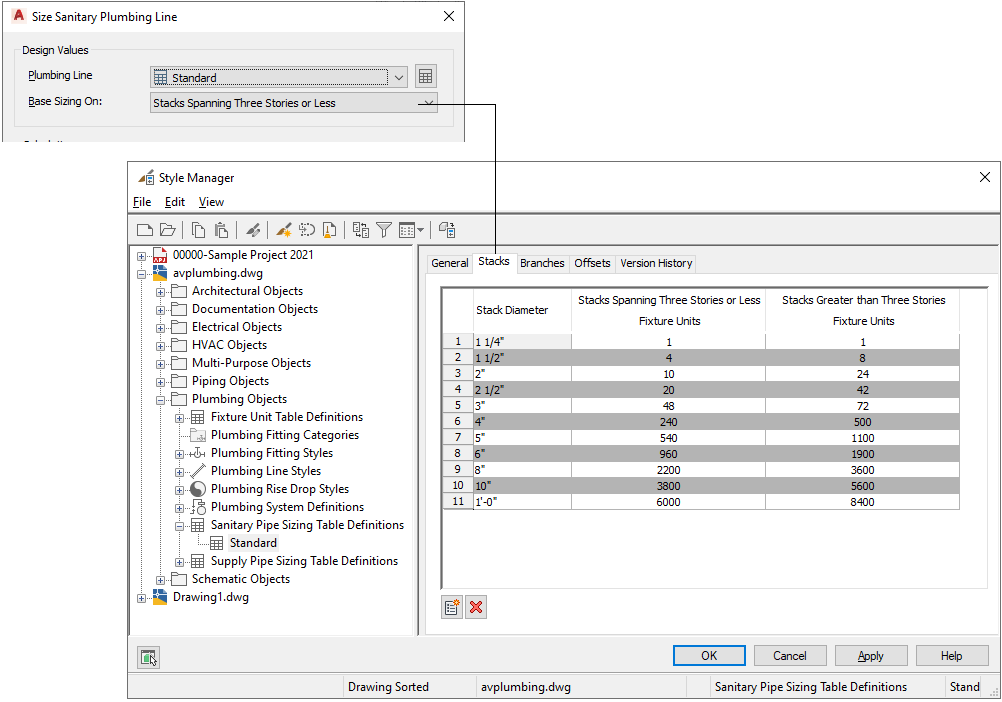 When you define your sanitary run as a stack spanning 3 stories or less, or more than 3 stories, the plumbing module performs the sizing calculations using the information on the Stacks tab in the sanitary plumbing line sizing table (pipe sizing table), whose definitions can be found in Style Manager.