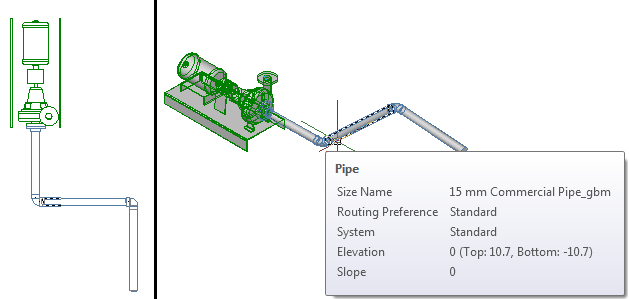 The following example shows sloped piping in plan versus SW Isometric views.