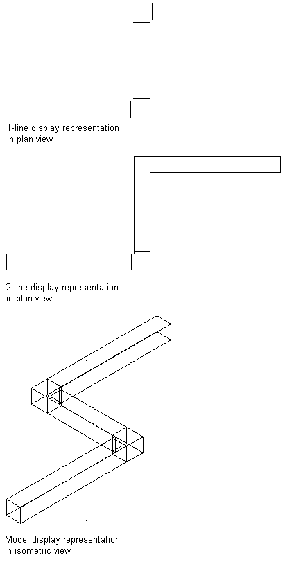 Most AutoCAD MEP 2027 toolset objects have 1 Line, 2 Line, Model, and Plan display representations. This is because these are the most common design scenarios that require different views of a building system.