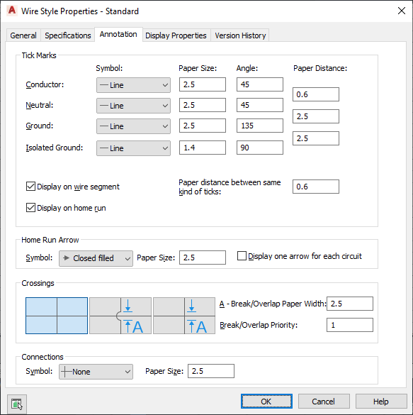 - Under Tick Marks, select a symbol type, and enter a tick mark size and angle for conductor, neutral, and ground.