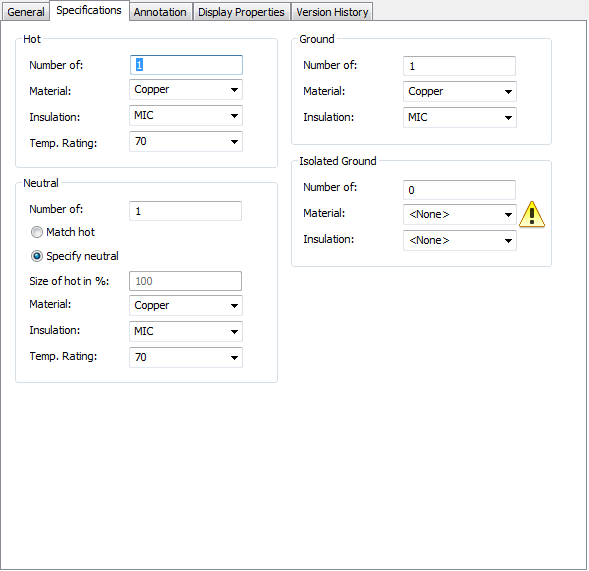 click Specify neutral, and then specify values for Material, for Insulation, and for Temp. Rating. |