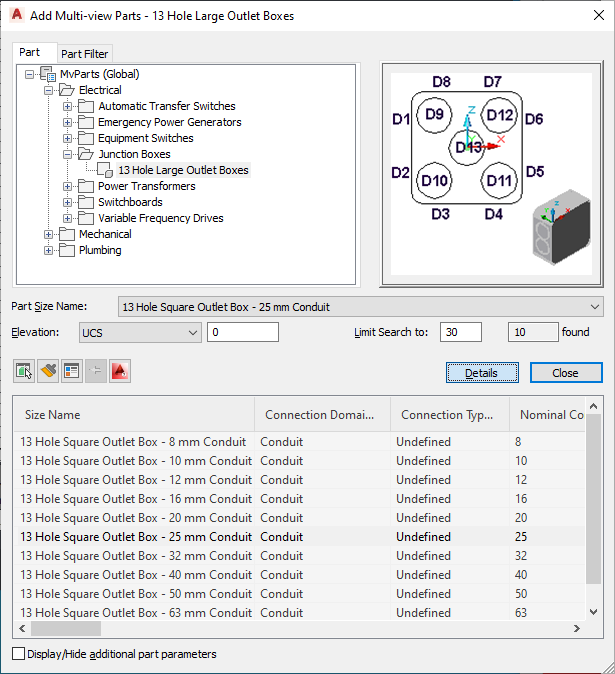 In the Add Multi-view Parts dialog box and Multi-view Part Modify dialog box, you can also use the Part Filter tab to specify part properties to query a part family to find a specific part size. You can view the part sizes available in a part family by clicking Details. The available part sizes are presented in an easy-to-navigate part size table. Select Display/Hide additional parameters to show all the parameters in the table.