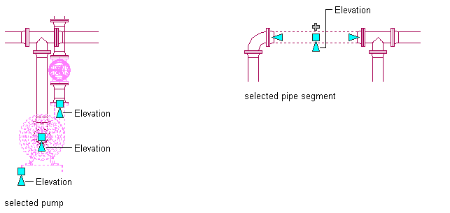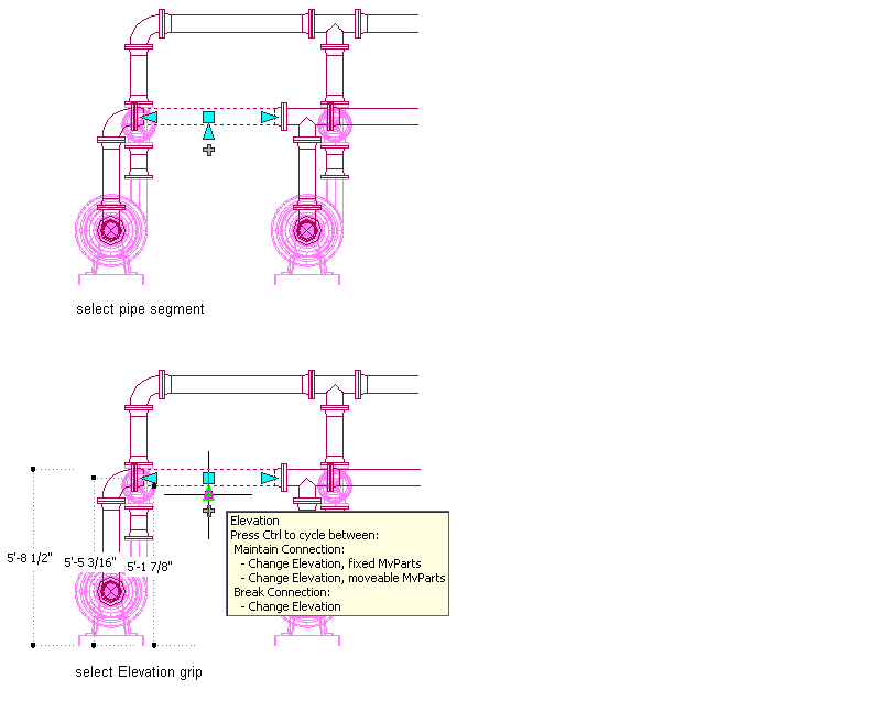 If the pipe segment or part is connected to other objects, you can specify whether to maintain their connectivity when you modify the elevation of the pipe object.