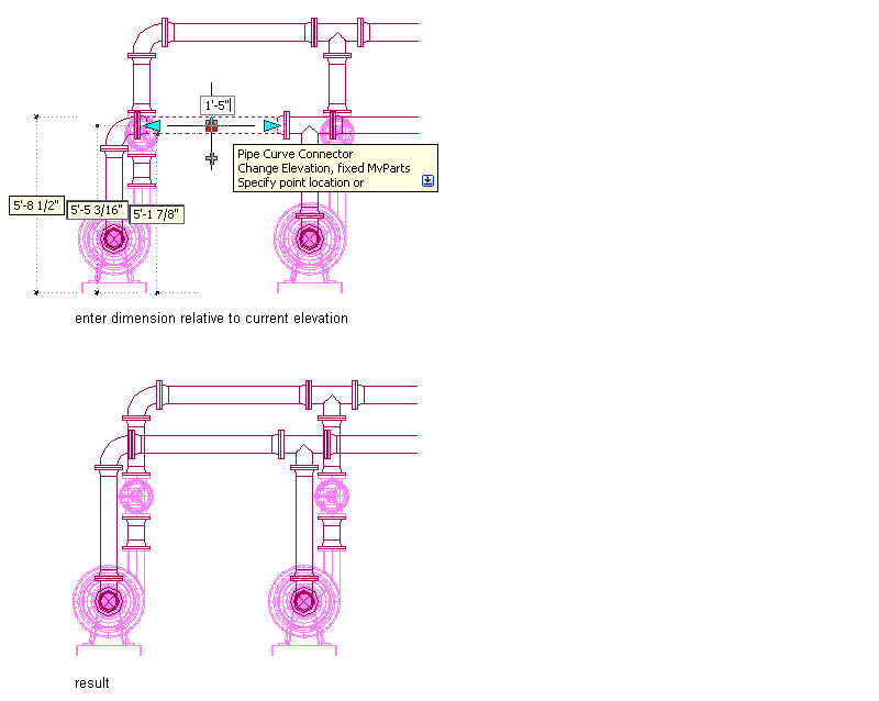 The following example modifies the elevation of a pipe segment. To provide more room for accessing the valve hand wheels, a horizontal pipe segment is raised by a dimension relative to its current elevation. As a result, the software adjusts connected objects and maintains connectivity.