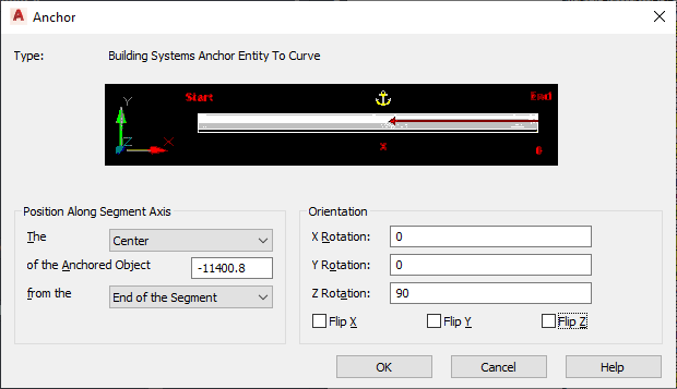 An anchor links an AutoCAD MEP 2027 toolset object to another object or to a layout curve or grid. In the Piping domain, this worksheet applies to fittings that use anchors (i.e., takeoffs). In the Schematic domain, it applies to symbols. You can view and modify the X, Y, and Z insertion points relative to the current coordinate system and rotation angle of the anchor. You can reposition anchored objects along a segment axis by specifying a dimensioned location or by flipping the anchor around the X, Y, or Z axis. The Anchor tab is available only after the objects have been anchored with an anchor tool.