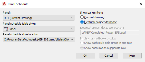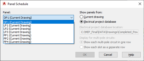 To generate a panel schedule for a panel that does not reside in the current drawing, you must specify an electrical project database (if one has not already been set) on the Electrical Project Database tab of the Electrical Preferences dialog box.