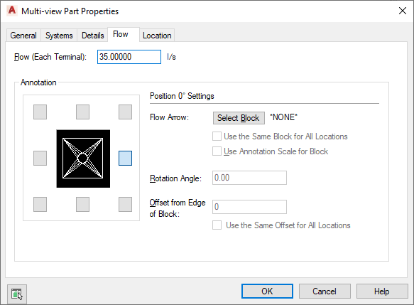 You can specify up to 8 locations to place flow arrows around the air terminal. You can select the block for the flow arrow, and optionally use the same block for all flow arrows or selecting different blocks based on location. You can specify the rotation angle and the offset from the air terminal for each flow arrow, and specify a flow value.