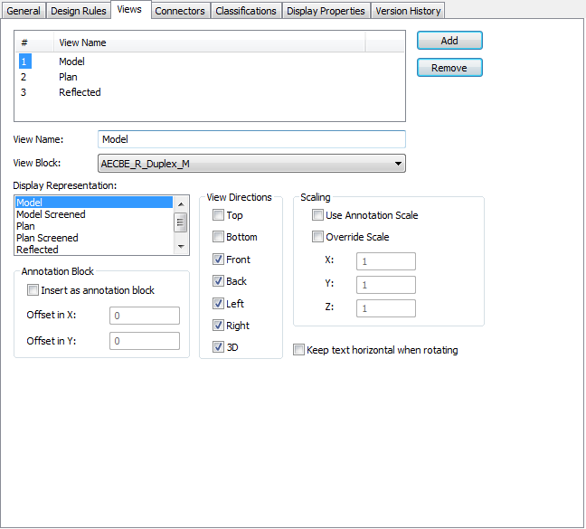 By defining multiple views with the same specified display representation and view directions, you can display an object using annotative and non-annotative view blocks at the same time, and you can configure the display properties of the view blocks differently. For example, you might have a junction box style that requires a view block to represent the symbology, and a second view block to represent the annotation. This allows you to define the appearance of the annotation view block by configuring the Annotation display component for the junction box, and to define the appearance of the symbol by configuring the other display components for the junction box.