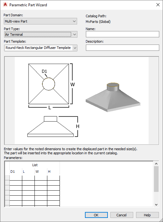 A part template is a fully configured and fully dimensioned parametric part that has a basic model but does not have any part sizes. The imperial and metric catalogs in AutoCAD MEP 2027 toolset include part templates for several, commonly used MvParts (for example, air terminals and pumps) and fittings. Using the Parametric Part Wizard, you can quickly create a new parametric part with custom sizes based on a part template.