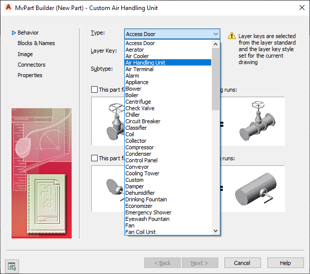 You assign a layer key to the part family for automatic layer mapping of part sizes. The same layer key is used for all part sizes of a part family. When you add a part that has a specified layer key to a drawing, the part is placed on the layer to which it is mapped. For example, according to the Aecb layer standard (AecbLayerStd4.dwg) and associated Mech - AIA 256-color layer key style, the Air Handling Unit layer key is mapped to the M-HVAC-Eqpm layer. When you add an air handling unit to your drawing, it is assigned to the M-HVAC-Eqpm layer. Only those layer keys predefined in the layer key style selected for the current drawing are available for selection in Content Builder. To learn more about layer keys, see .