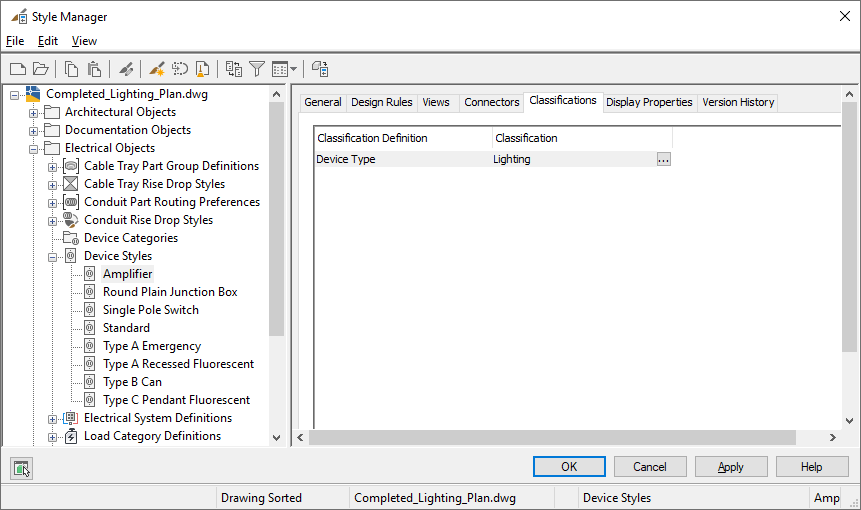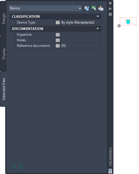 Because a device in a drawing is an instance of a device style, the device has a property for each classification definition in the device style. On the Extended Data tab of the Properties palette, you can view or override the classification for one or more devices in the drawing.