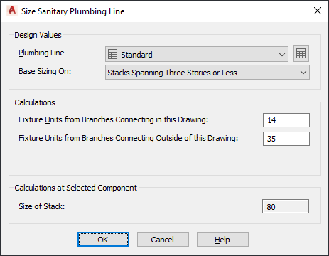 If you based the sizing on stacks, the Size Sanitary Plumbing Line dialog box displays the results of the sizing for the stacks in the drawing.