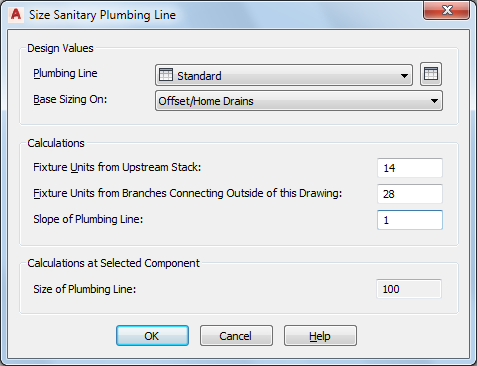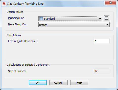 The Fixture Units Upstream value is the result of all connected fixtures in the drawing. This value assumes that all connected fixtures are in the current drawing. Once the Fixture Unit Upstream value is defined, the software calculates the value for Size of Branch.