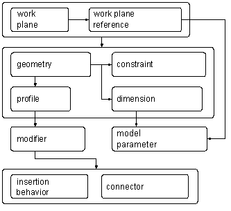 The following sections introduce the features of modeling. Refer to this illustration as you learn more about each feature to help you understand the relationships between features.