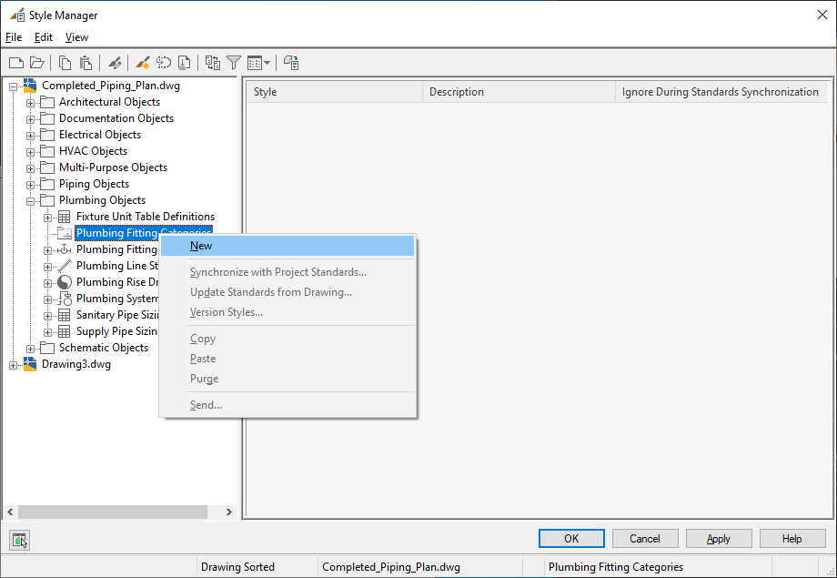 - Right-click the desired category — in this case, Plumbing Fitting Categories. Then click New.