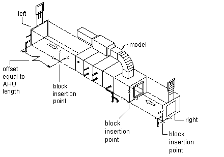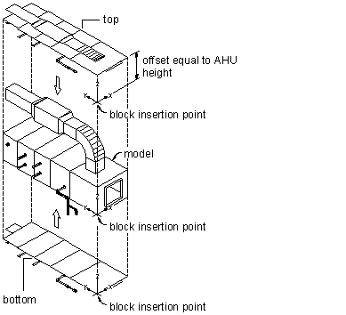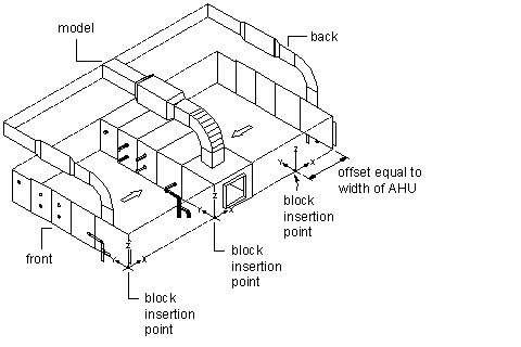 The previous illustrations show the insertion point of the model view as the right corner of the bottom edge of the front side. The top and bottom views have an insertion point at the right corner of the front edge, with the top-view insertion point offset by the height of the air handling unit. The front and back views have an insertion point at the right corner of the bottom edge, with the back-view insertion point offset by the width of the air handling unit. The left and right views have an insertion point at the bottom-front corner, with the left-view insertion point offset by the length of the air handling unit.