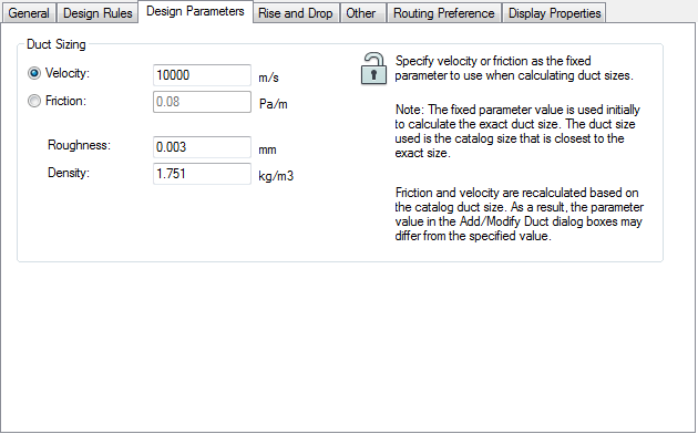 Note: The Add Duct dialog box displays the fixed parameter value with an asterisk (*). The fixed parameter value initially calculates the exact duct size, and is then used to specify an available size in the catalog. Once you calculate duct size, the fixed parameter value in the Add or Modify dialogs might differ from what is specified in Design Parameters. See Duct Sizing Methods and Tools for more information.