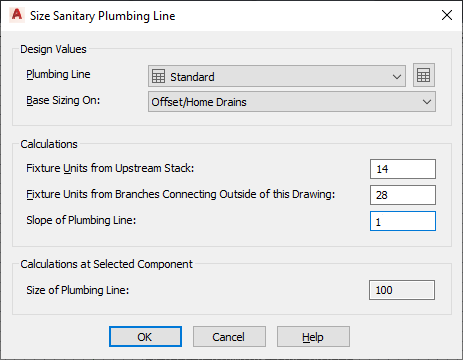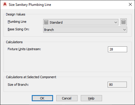 - Enter the result for Fixture Units from Branches Connecting Outside of this Drawing. The selected run is sized appropriately, and the value for Size of Plumbing Line is updated accordingly.