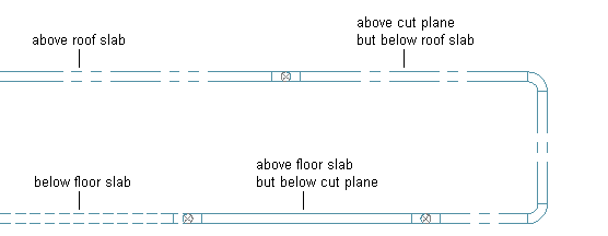 In some regions, construction documents must show building system objects differently based on their elevation. For example, you might be required to display an object below the floor slab in the plan view with one linetype, and another object above the floor slab but below the cut plane with another linetype.