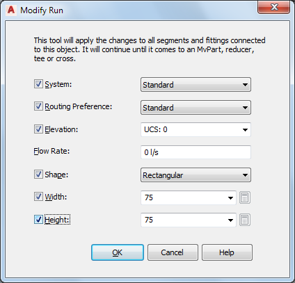 Modify Run dialog box (for duct)