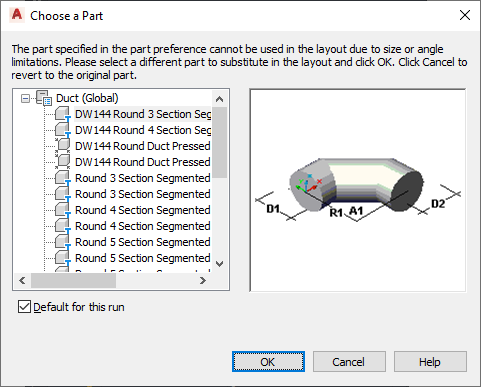The Choose a Part dialog box displays if you try to add or modify a part in a run that is not stored in your preferences. You will be prompted to make a substitution from the catalog. The following example shows the dialog box in the Ductwork domain in the Global profile: