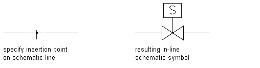 - In-line symbols. These symbols can be anchored anywhere along a schematic line. Fittings, valves, gauges, and controls such as switches, signals, and devices are examples of in-line symbols. These symbols are attached to the line. They move when the line is moved, and they are erased when the line is erased. You can also relocate the symbol by moving the symbol along the schematic line.