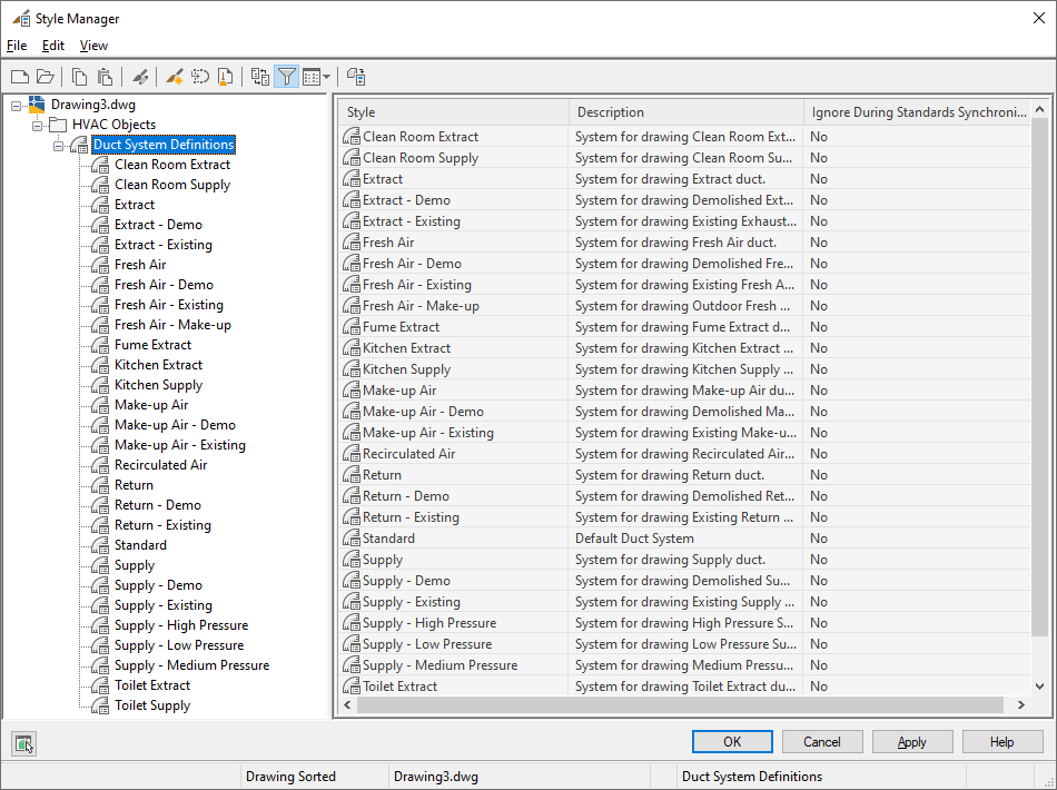Systems can be created as needed during design layout. However, it is recommended that a series of systems be defined at the start of a project and maintained throughout its life. AutoCAD MEP 2027 toolset provides a set of predefined systems based on common industry standards. Each system has default definitions including system abbreviations, layer keys, and display properties.