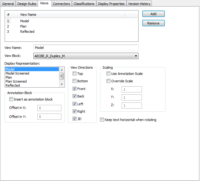 In the dialog box, the displayed settings change depending on whether you select a device style, a device view, or a connector in the table. For example, in the following images, notice how the heading names differ depending on the selected object.