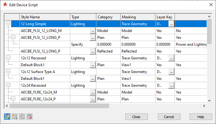 The Category property in the script does not display in the Style Manager. Device categories are the mechanism by which you group the devices (device styles) in the Select Device worksheet, making it easier to browse the available devices. You create and manage device categories directly in the worksheet; for more information, see Creating Categories in AutoCAD MEP 2027 toolset.
