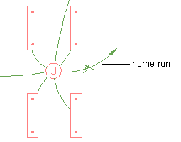 While you can use a single home run to represent the connection of one or more circuits to a single panel, sometimes devices are assigned to multiple circuits on different panels. For example, you might have a lighting fixture with 2 electrical connectors, where the first connector is assigned to a circuit on a panel for normal lighting, and the second connector is assigned to a circuit on a panel for emergency lighting. When a device is assigned to multiple circuits on multiple panels, you must add a home run to each panel. This allows you to subsequently tag each home run with the correct panel information. Make sure the locations of the electrical connectors in the device style are not the same, so you are able to draw a home run from each connector.