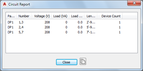 As you create schedules for your electrical design, you might find it helpful to view information about particular circuits in the drawing. In a circuit report, you can view the assigned panel name, circuit name, voltage, load (in VA), circuit length, and number of devices for one or more selected circuits.