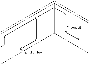 To add cable trays and conduits to a drawing, you draw the main runs, locating the risers. As you draw cable tray or conduit runs, you lay out wireway geometry by specifying points in the drawing. The software automatically adds fittings to connect segments when forming a run and to connect runs to risers and branches when forming a network (auto layout). You can also add fittings manually.