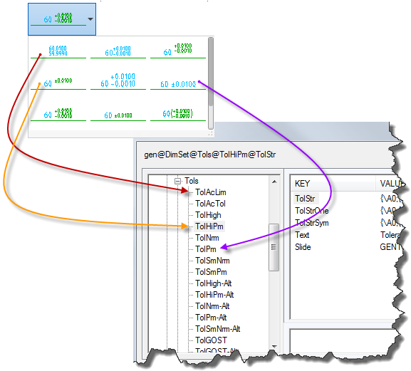 The thumbnails of tolerances in the Tolerance drop-down correspond to the first eight entries under Acad/M > DimSet > Tols, in the System Editor. The names of these entries begin with “Tol” (for example, TolHigh). The remaining entries refer to the alternative unit representation of tolerances; their names end with “-Alt.” For example, TolHigh-Alt is the alternative unit representation of TolHigh.