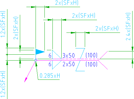 In order to control the size of these elements (excluding the reference and identification lines and the all around symbol) you can change the scale factor property of the welding symbol. The illustration shown below is an ISO welding symbol. The heights of the various elements that depend on the text height are shown as a formula, where H is the text height and SF is the scale factor. The formula changes from drafting standard to drafting standard.
