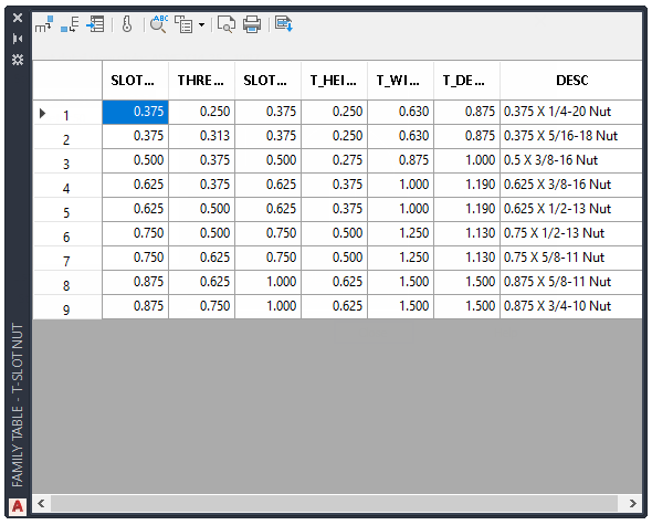 The Family Table is a database that contains valid values for parameters that define each member of the family. Each row describes a unique member of the part/feature family.