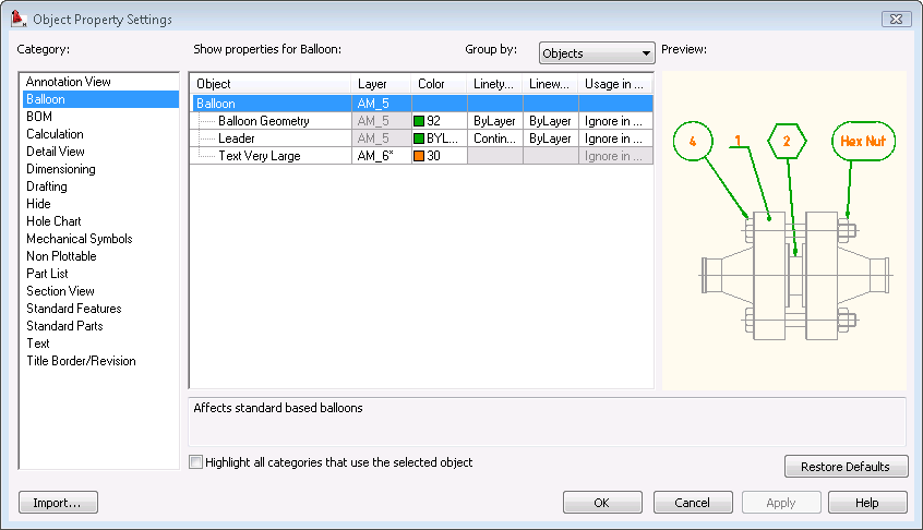 In the Object Property Settings dialog box, you can predefine the properties of objects that AutoCAD Mechanical toolset commands create.