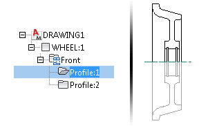 In this example, a folder, Profile:1, contains the upper wheel profile. Profile:2 is another instance of this folder, created by mirroring Profile:1. Changing one profile automatically updates the other.
