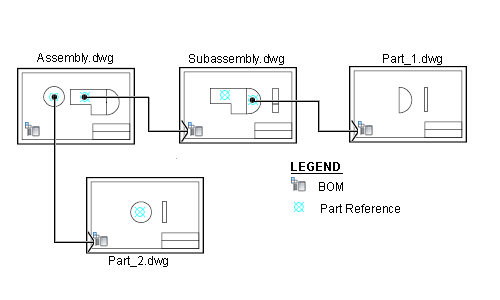 In the part drawing, you specify the component properties of the part in the Assembly Properties dialog box (using the AMPARTREFEDIT command). The Part Reference in the assembly drawing automatically retrieves the component properties from the part drawing, which in turn updates the BOM in the assembly drawing.