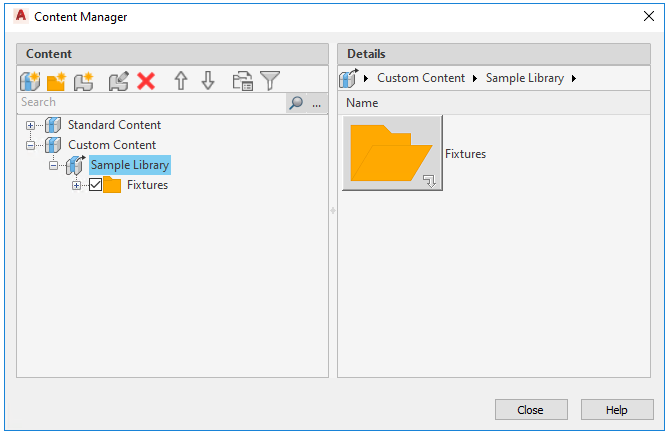 The AMCONTENTMANAGER command displays the Content Manager dialog box, which contains many tools to create and manage content libraries.