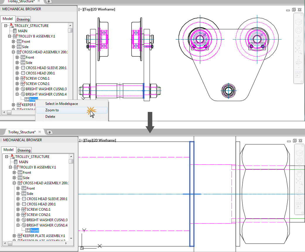 When you right-click a component, a component view or a folder in the mechanical browser and select Zoom to, the drawing area displays the corresponding object as large as possible.