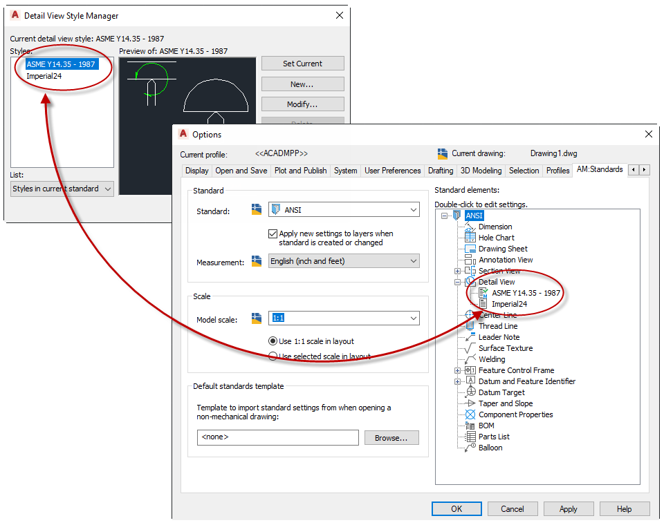 The settings that control the appearance of AutoCAD Mechanical toolset objects are saved to a named collection of settings known as the drafting standard. As such, the manner in which detail view styles apply to AutoCAD objects (model documentation detail views) is different to how they apply to AutoCAD Mechanical toolset objects (AMDETAIL detail views). Accordingly;
