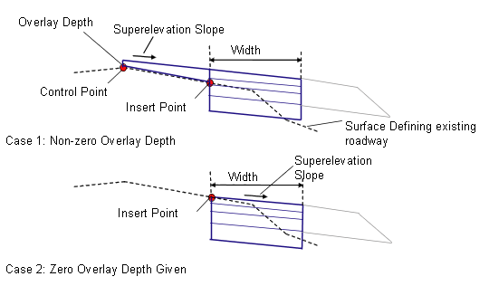 If the Overlay Depth is zero, the widening lane extends outward from the Insert Point Offset on the Existing Surface at the superelevation slope for the given Width.